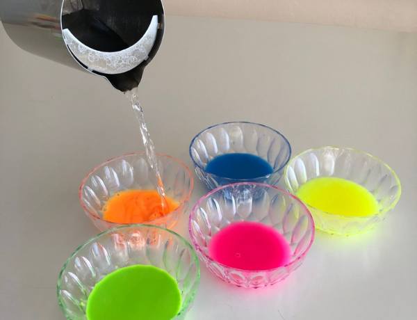 Squirt some neon paint into each bowl — one bowl for each color. pour the same amount of very warm water into each bowl and stir until the paint is dissolved. pour ¼ cup of white vinegar into each bowl, and mix well with a spoon.
