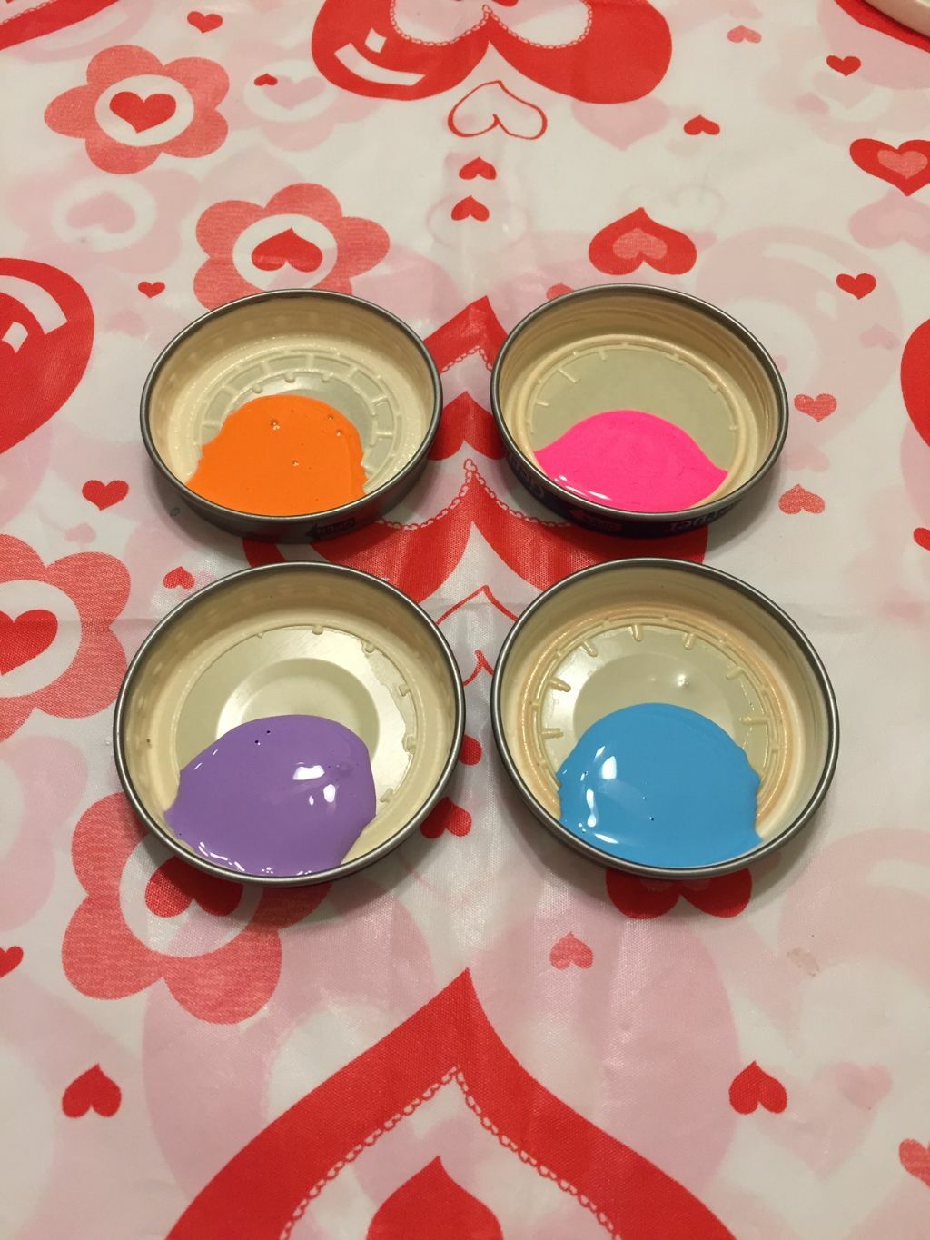 Squeeze several drops of acrylic paint (various colors) into jar lids.