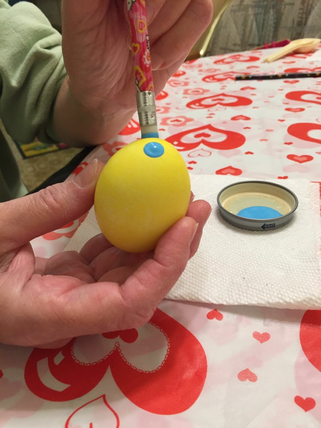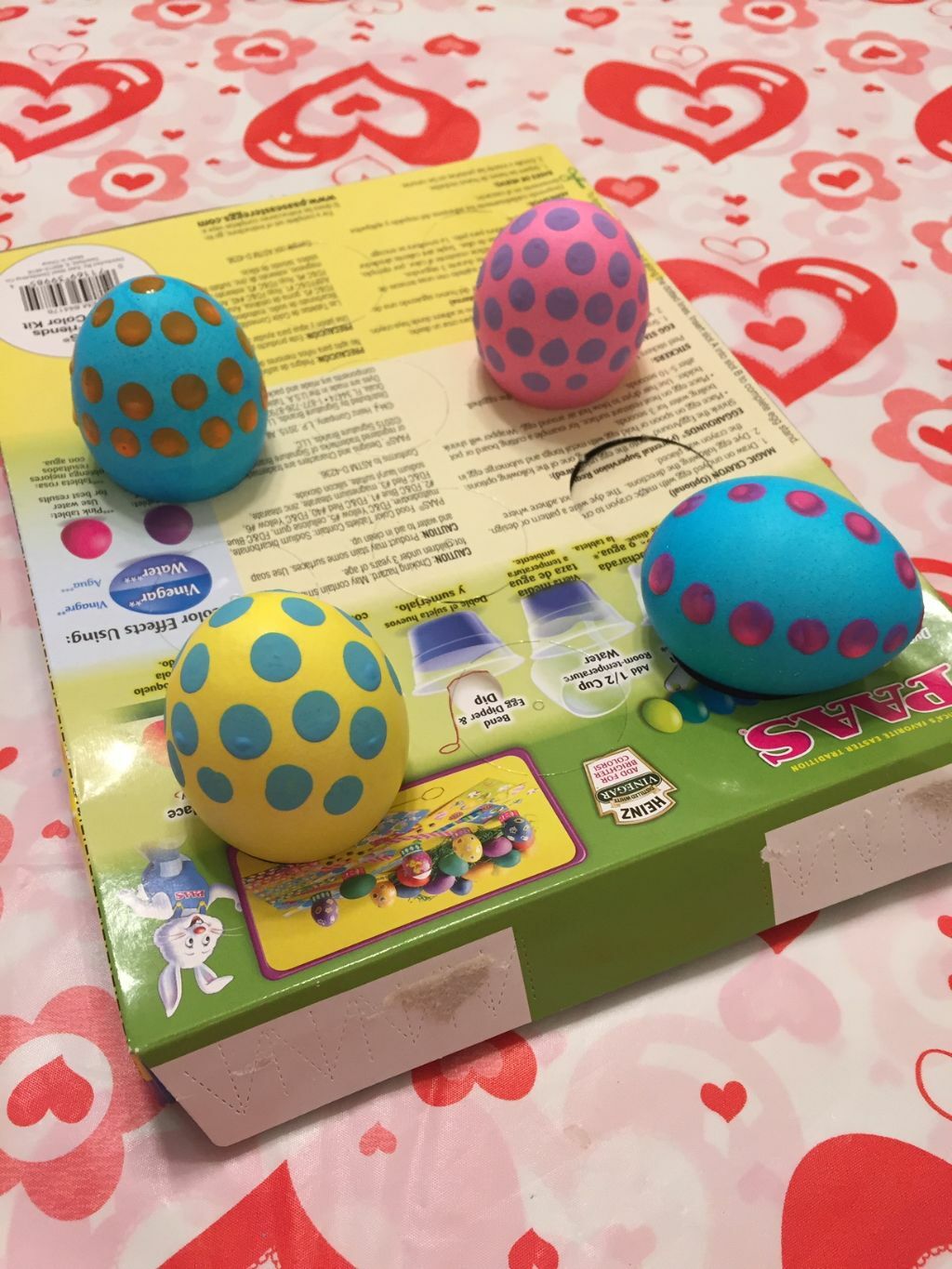 Repeat steps 7 and 8 until all eggs are covered with polka dots. Let eggs dry.