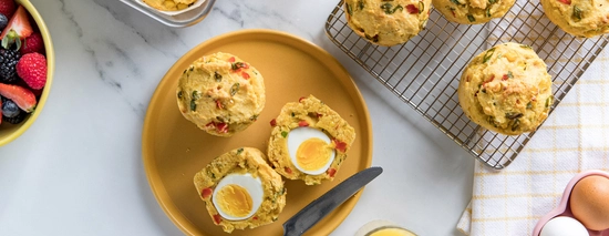 - Bake muffins for 30-35 minutes, or until lightly golden and a toothpick comes out clean. Take care to not press the toothpick too deep to puncture the egg.